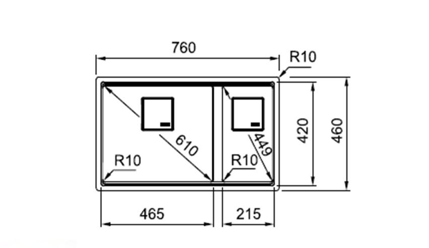 黄金盆胆圆角R10, 既美观又易清洁;
