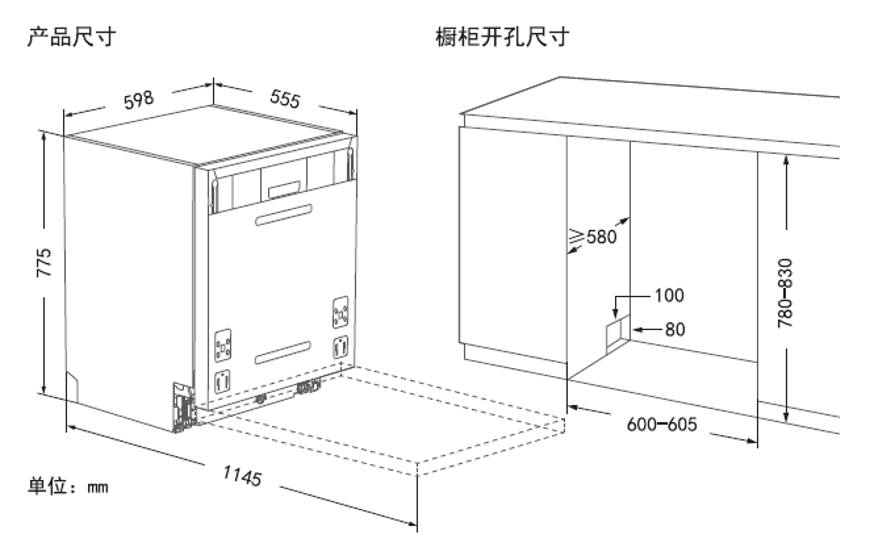 开孔尺寸(宽 * 高 * 深 ) | 600-605×780-830*min580mm |