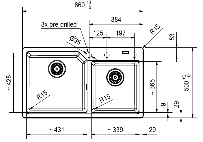 盆胆圆角 R15,盆胆空间充分利用,美观易清洁;