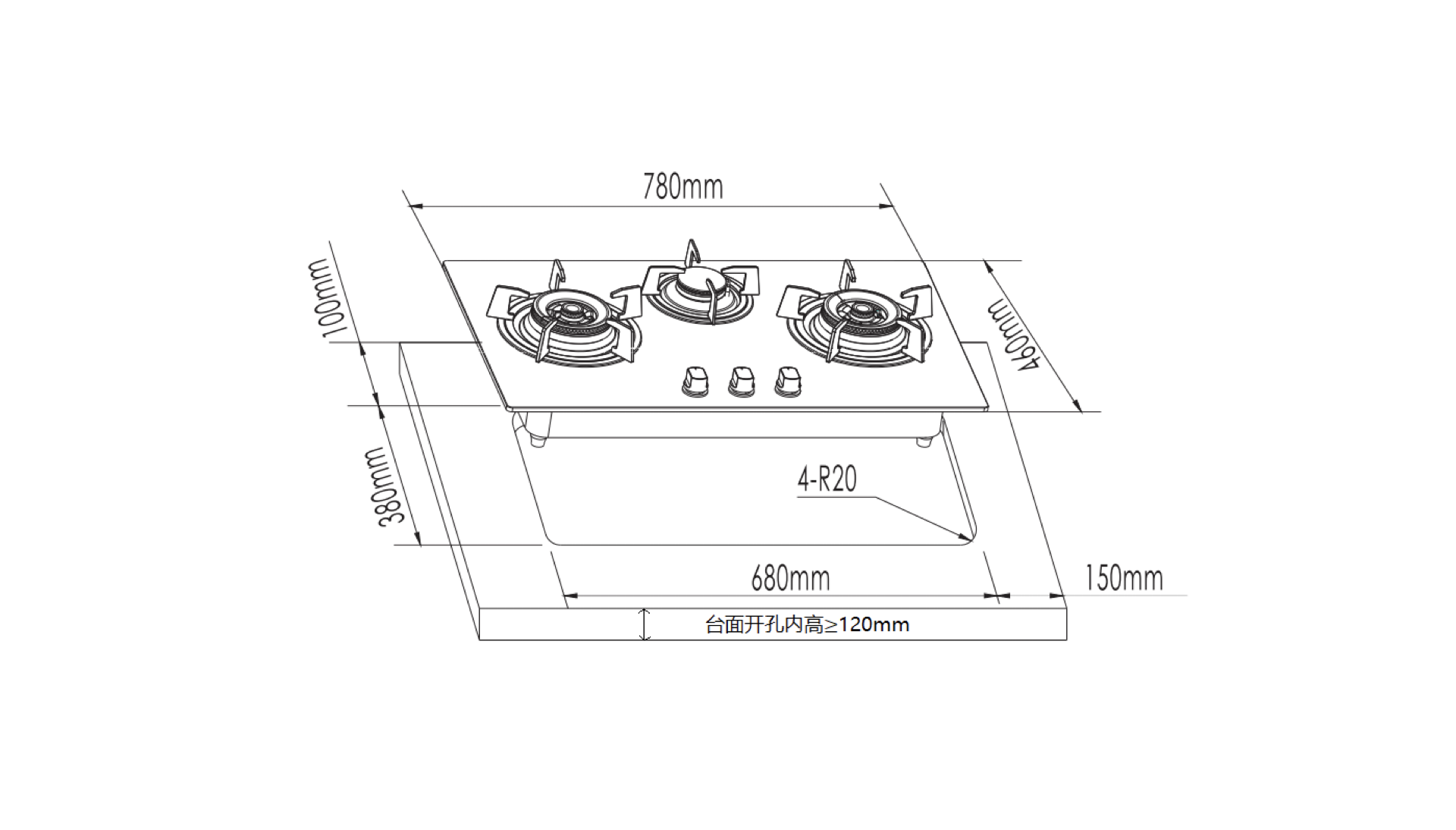| 开孔尺寸(L x W) | 680 x 380 mm 4-R20 |